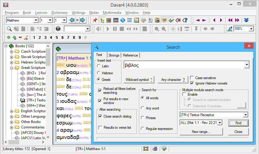 | Example of search dialog for greek word. This is almost same as in Davar3, added Regular expression search and Multiple module search mode. If enabled, ... button will display module tree where you select modules for searching. |