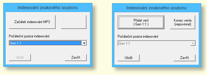 3) PRVNÍ kliknutí myší na tlačítko (Začátek indexování MP3) spustí přehrávání MP3. Přibližně 0.2 - 0.5 sekundy před očekávaným startem dalšího verše (Gen 1:2), stiskněte tlačítko znovu (Přidat verš Gen 1:1). Viz obrázek nahoře vpravo. Pozice textu v okně bude posunuta. Pokračujte v klikání na tlačítko dle přehrávaného MP3. Při indexování obvykle postačuje přidávat začátky každého verše. V některých případech (např. při výskytu dlouhých mezer mezi verši nebo nějakého nechtěného zvuku) můžete přidat také konec verše, stlačením tlačítka "Konec verše".
