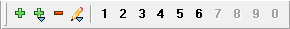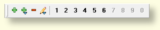 1 2 3 4 5 6 7 8 9 0: 10 tlačítek se záložkami. Pokud je pozice prázdná, barva je šedá (=barva neaktivního tlačítka), pokud je pozice obsazená, tak je barva aktivní. Můžete použít ukazatel myši k zobrazení tipu na tlačítku s informacemi o záložce.