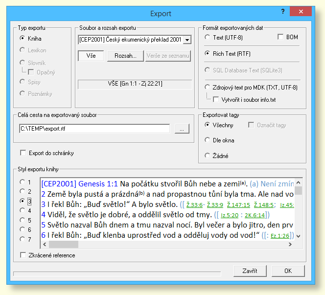 Styl exportu knihy (1-7): Můžete si vybrat ze 7 předdefinovaných stylů exportu knihy. Styl 3 (základní) je vizuálně stejný, jako text zobrazený v okně. Pokud si přejete použít zkrácené reference (umístěné před každým veršem), zatrhněte volbu Zkrácené reference.