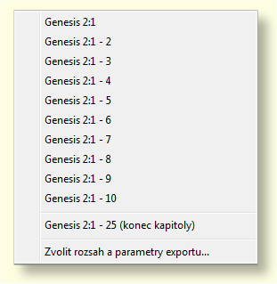 V některých případech můžete potřebovat rychle exportovat krátkou část textu knihy. Například jste v překladu CEP2001 na pozici Genesis 2:1 a přejete si exportovat rozsah Gen 2:1-5 do schránky a potom vložit do MS Wordu. V tomto případě můžete použít Rychlý export: na textu knihy stiskněte pravé tlačítko k zobrazení kontextové nabídky - vyberte příkaz Kopírovat verše do schránky, který potom zobrazí další úroveň kontextového menu s následujícími příkazy (jako příklad):