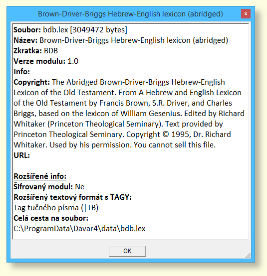 Zde si můžete přečíst o copyrightu modulu, verzi modulu, autorech textu, jeho historii a informace o konverzi textu pro Davar. Je zde rovněž seznam všech tagů, které byly v textu modulu použity. Pro některé moduly je zde místěna adresa URL, kde můžete získat informace o nově vydaných verzích textu.