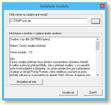 Po kliknutí na Instalovat budou okna všech otevřených modulů zavřena, ZIP soubor bude rozbalen do adresáře \temp\ a soubory budou potom kopírovány do adresáře \data\ . Staré soubory budou přepsány. Po instalaci budou okna modulů opět otevřeny tak, jak byly před instalací, kromě oken s výsledky hledání.