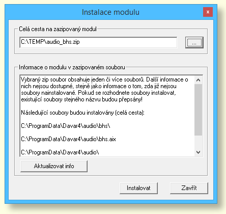 Instalátor modulů Vám pomůže nainstalovat moduly ze zipovaných souborů, které jste si stáhli z domovské stránky programu Davar4. Okno instalátoru má pevnou velikost, je vždy nad ostatními okny a před další prací v programu je třeba ho uzavřít.