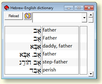 Příklad Hebrejsko - Anglického slovníku (He-En): hlavní směr je He->En, opačný směr (En->He) může být přepnut tlačítkem v horní části okna. Psaní v editačním poli provádí okamžitou synchronizaci nejbližšího slova. Pokud stisknete klávesu Enter, aktivuje se filtr který zobrazí všechna slova, která obsahují text z editačního pole. Můžete využít i zástupné znaky * a ?.