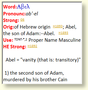 |SH3of Hebrew origin |RH1893|Rh; Abel, the son of Adam:--Abel. |RH01893|Rh|Sh3 - 4. záhlaví, zde je zobrazen Hebrejský Strongův index, např. |RH1893|Rh