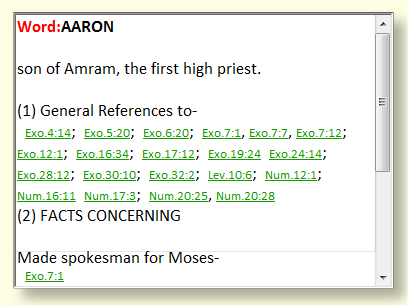 |SKAaron|Sk|SH0|TBAARON|Tb|Sh0 |Cson of Amram, the first high priest.|C |C(1) General References to-|C |RROTExod:4:14|Rr; |RROTExod:5:20|Rr; |RROTExod:6:20|Rr; |RROTExod:7:1|Rr,|RROTExod:7:7|Rr,|RROTExod:7:12|Rr; |RROTExod:12:1|Rr; |RROTExod:16:34|Rr; |RROTExod:17:12|Rr; |RROTExod:19:24|Rr |RROTExod:24:14|Rr; |RROTExod:28:12|Rr; |RROTExod:30:10|Rr; |RROTExod:32:2|Rr; |RROTLev:10:6|Rr; |RROTNum:12:1|Rr; |RROTNum:16:11|Rr |RROTNum:17:3|Rr; |RROTNum:20:25|Rr,|RROTNum:20:28|Rr |C(2) FACTS CONCERNING|C |CMade spokesman for Moses-|C |RROTExod:7:1|Rr |CWith Hur, supports Moses' hands during a battle-|C |RROTExod:17:12|Rr |CMade the High Priest-|C |RROTExod:28:1|Rr |CBroke the covenant and made the Golden Calf-|C |RROTExod:32:2|Rr-|RROTExod:32:4|Rr |CExcluded from the Promised Land-|C |RROTNum:20:12|Rr |CDied on Mount Hor-|C |RROTNum:20:28|Rr