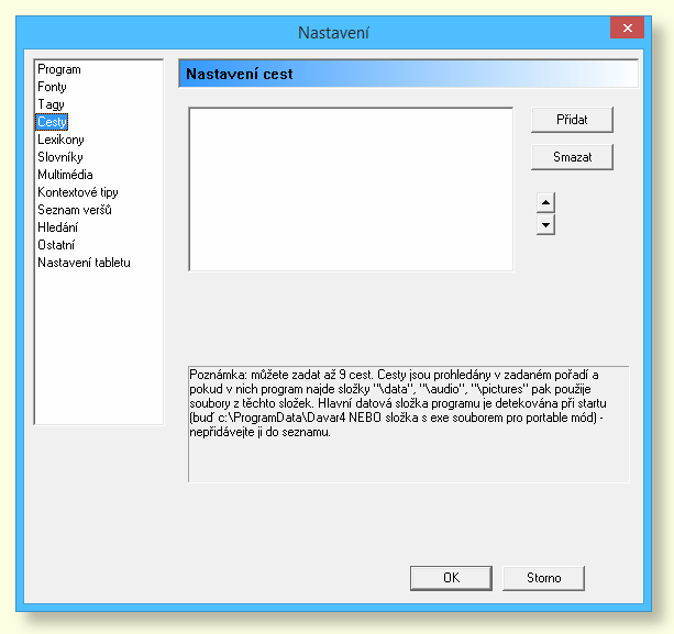 Tlačítko Přidat slouží ke vložení cesty na zvolenou složku. Pomocí Smazat provedete vymazání zvolené cesty. Tlačítka se šipkami provedou přesun zvolené cesty v seznamu směrem nahoru nebo dolu. Je důležité, aby podadresář \data byl v každé zadané cestě. Podadresáře \audio a \pictures můžou být rovněž vytvořeny.