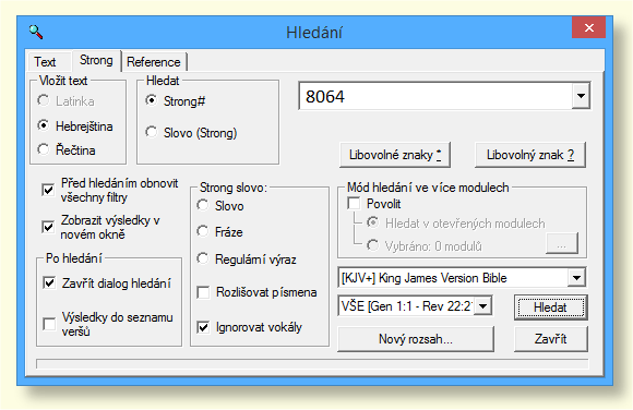 Snadnější způsob je kliknout pravým tlačítkem na tag Strongova indexu v knize nebo lexikonu a zvolit příkaz Hledat... Dialog hledání se potom otevře se všemi parametry automaticky nastavenými.