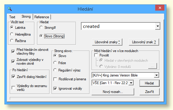 Dialog hledání pro Strongovo slovo created v anglickém překladu KJV+ byl zobrazen po kliknutí na slovo "created" v Gen 1:1, výběrem příkazu Hledání..., kliknutím na záložku Strong a přepnutím do módu Slovo (Strong).