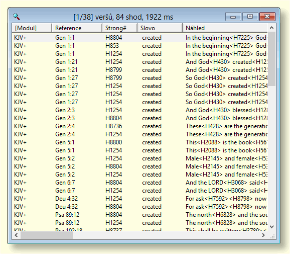 Výsledky hledání pro Strong# slovo created, zobrazeny jako tabulka. Všimněte si 3 řádků pro výskyt v Gen 1:1 - zde jsou slovu přiřazeny 3 Strongovy indexy.