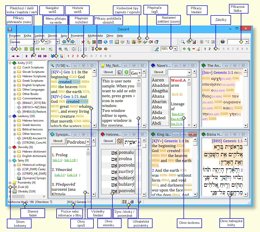 Davar4 používá rozhraní pro více dokumentů (nazývané "MDI"). V hlavním okně programu můžete otevřít až 30 dceřinných oken. Jedno či dvě otevřená okna s texty je často dostačující, ale pro pokročilá studia je vám umožněno otevřít mnoho oken s texty knih, lexikonů, slovníků, spisů a poznámek. Rovněž můžete otevřít mnoho oken s výsledky hledání. Davar4 může uložit pozice oken jako Rozložení a rychle mezi nimi přepínat. Následující obrázek ilustruje některé důležité vlastnosti uživatelského rozhraní hlavního okna.